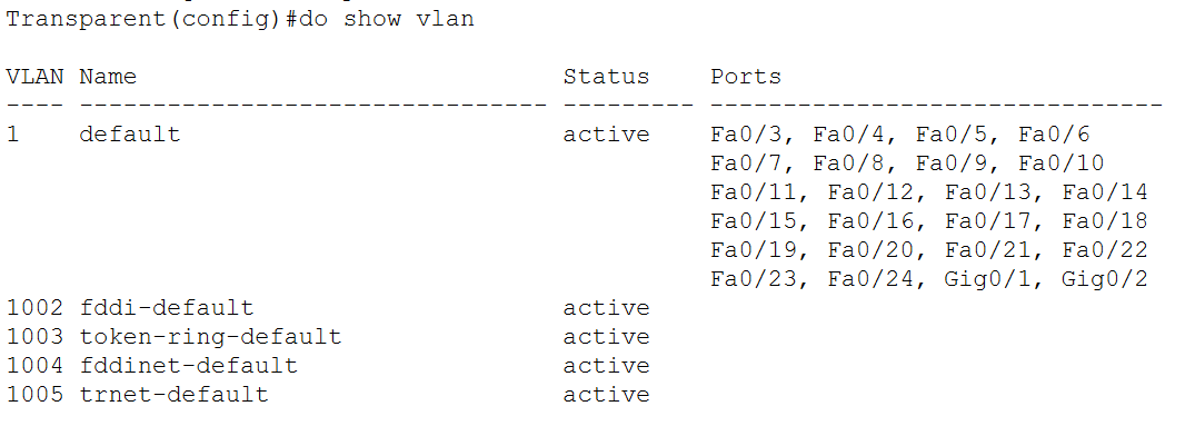Jika kita lihat di switch VTP Transparent, maka tidak ada VLAN yang telah dibuat. Itu karena VTP Transparent tidak memiliki sifat sinkronisasi.